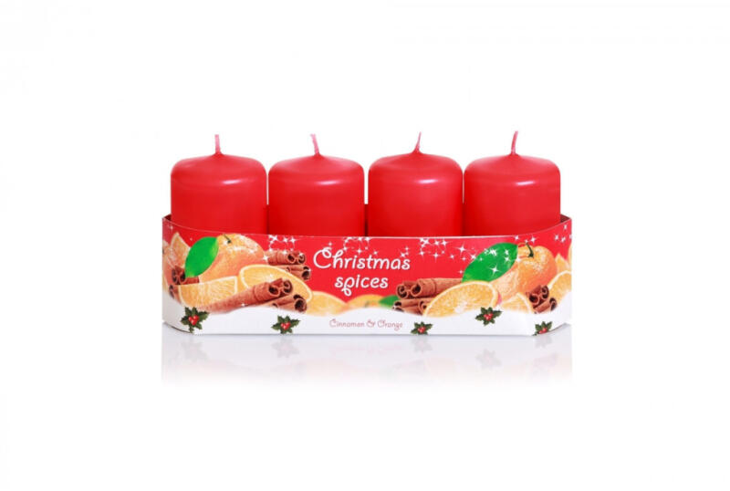 title Gyertya adventi piros narancs-fahéj illatú 4 db, 4 cm x 7 cm