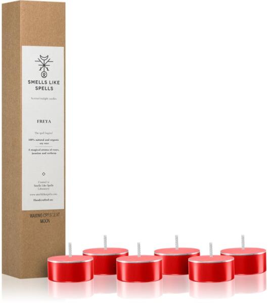 Smells Like Spells Norse Magic Freya, 6 db, Teamécses Illatok lakásba, A romantikus vacsorákhoz nélkülözhetetlen Smells Like Spells Norse Magic Freya teamécses a hétköznapi esték hangulatát is tökéletessé teszi. A teamécses tartóba helyezett mécses hamar az otthona kiegészítőjévé válik és minden kisebb helyiséget kellemesen illatosít. Többféle illat kombinációjával ízlése szerinti illatélményt alkothat velük. Tulajdonságok: virágos illat gyógyfüves aroma friss illat Használata: A mécsest kellően hőálló felületre helyezze. 4 óránál hosszabb ideig ne hagyja égni. Mindig vigyázzon arra, hogy a mécses ne égjen le teljesen az aljáig. Soha ne hagyja az égő mécsest felügyelet nélkül és gyúlékony tárgyak közelében. Tartsa távol a gyermekektől és háziállatoktól. A mellékelt útmutató szerint járjon el.
